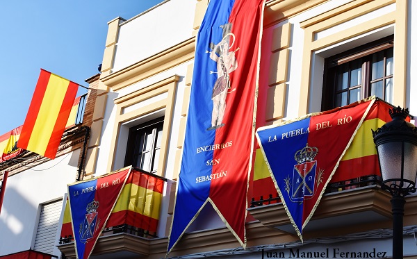 El pasado sábado 20 de Enero tuvo lugar, en la localidad sevillana de Puebla del Río los actos de celebración de sus fiestas patronales en honor a San Sebastián. La Banda Municipal de Puebla del Río inicio la jornada con marchas militares a su llegada a la típica “Esquina del Reloj”. La salida del patrón San Sebastián a las calles de Puebla con el posterior chupinazo a cargo de Los Romeros de la Puebla en sus bodas de oro, acompañados por Rafael Menéndez (párroco de Puebla del Río); el alcalde, Manuel Bejarano, el maestro Morante de La Puebla y el delegado de Festejos, Ricardo Mateo Costales. Destacar la presencia y el desfile de la legión