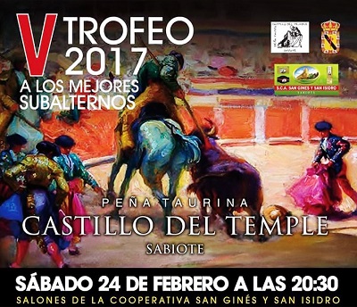 El próximo sábado 24 de Febrero la Peña Taurina Castillo del Temple de Sabiote va hacer entrega del trofeo a los mejores subalternos en su quinta edición.Dichos galardones han recaído en Manolo Quinta (picador de la cuadrilla de Enrique Ponce) y José Antonio Carretero (cuadrilla de Morante de la Puebla).El acto va a tener lugar a partir de las 20:30 horas en los salones de la Cooperativa de San Ginés y San Isidro y va a ser moderado por el periodista Luis Miguel Parrado