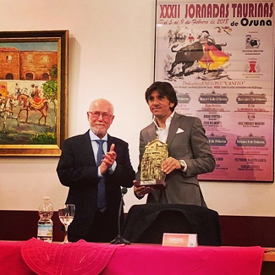 Diego Ventura ha recogido esta noche en la localidad sevillana de Osuna el premio del “Mejor Rejoneador Feria Taurina de Osuna 2017”.Dicho acto se ha celebrado tras una tertulia con dicho jinete y el periodista taurino Juan Belmonte dentro de las XXXII Jornadas Taurinas de Osuna