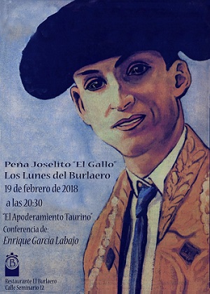 La Peña Taurina Joselito el Gallo de Granada ha organizado para el próximo lunes 19 de Febrero una charla coloquio sobre el “Apoderamiento Taurino”. Dicha charla correrá a cargo de Don Enrique García Labajo (notario y apoderado taurino).La cita será en el Restaurante El Burlaero de Granada a partir de las 20:30 horas
