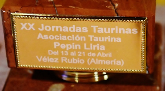 En la noche de ayer tuvo lugar la entrega de galardones y reconocimientos de la Asociación Taurina Pepín Liria de Vélez Rubio. Dicho acto fue la clausura de las XX Jornadas Taurinas de la citada asociación. Los galardonados fueron: