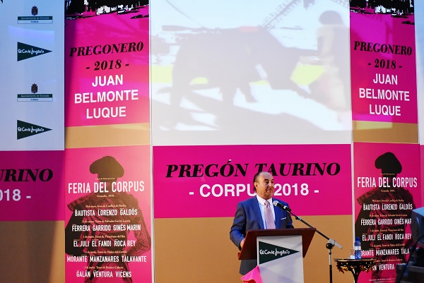 En la noche de ayer tuvo lugar el tradicional pregón taurino de la Feria del Corpus de Granada, el cual sirve de antesala de los festejos taurinos que tendrán lugar a partir del miércoles 30 de mayo en la plaza de toros de Granada. El pregonero de este año ha sido Don Juan Belmonte (periodista taurino), el cual conto sus vivezas en Granada en su larga trayectoria taurina. El acto tuvo lugar en el patio central del Excmo. Ayuntamiento de Granada y fue presentado por María Dolores Martínez (periodista taurina de Granada)
