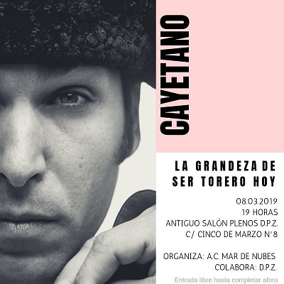 El diestro Cayetano Rivera va a participar el próximo viernes 8 de marzo en una tertulia organizada por la Asociación Cultural “Mar de Nubes” la cual difunde y defiende la tauromaquia en Zaragoza. Dicha tertulia se ha denominado “La grandeza de ser torero hoy” y cuenta con la colaboración de la Diputación de Zaragoza